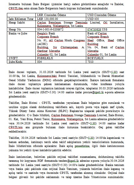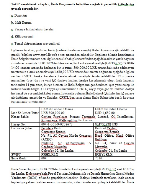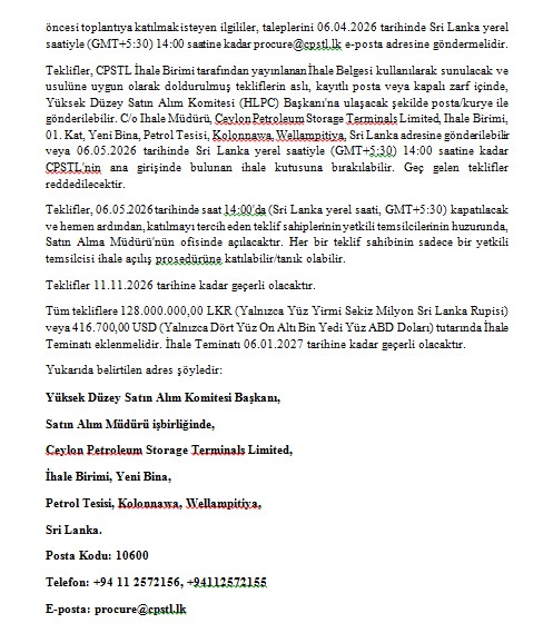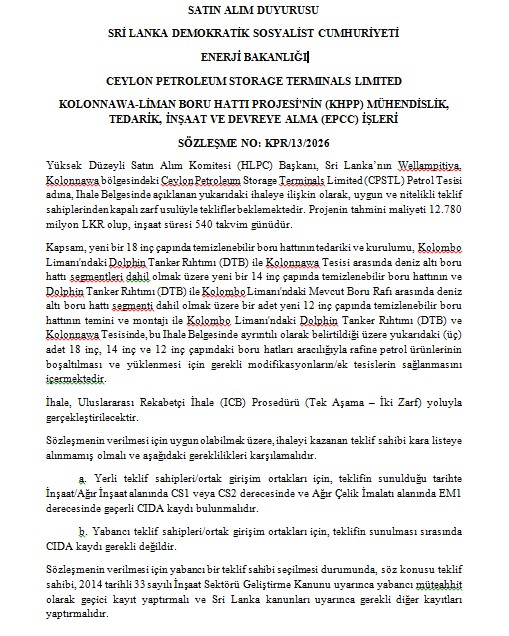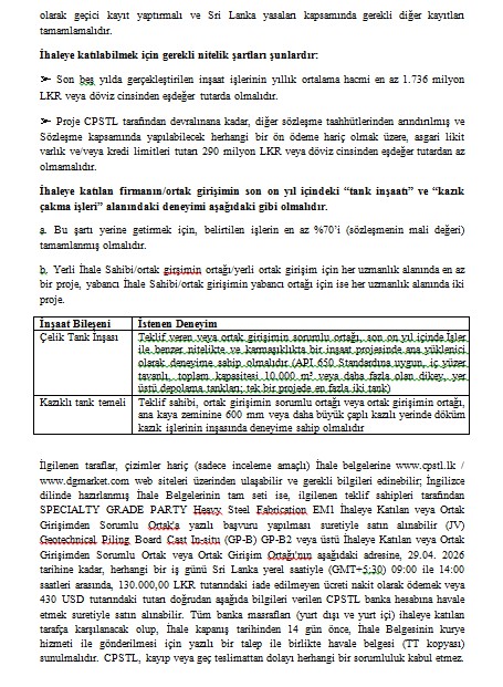 İhale Duyurusu (IFB) - Ceylon Petroleum Storage Terminals Limited (CPSTL), Sri Lanka’nın Kolonnawa Tesisinde 30 ve 31 Numaralı Petrol Depolama Tanklarının Yenilenmesi