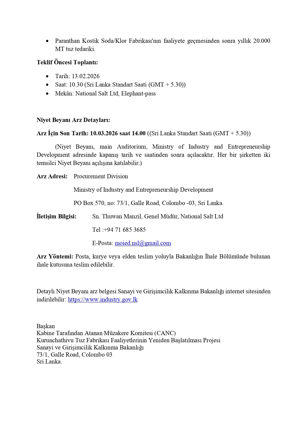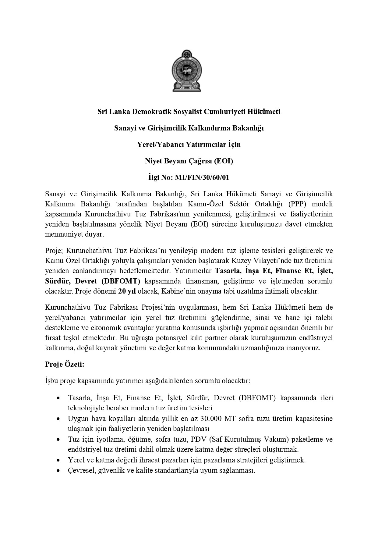 Kurunchthivu Tuz Ocağı’nın Kamu-Özel Ortaklığı Modeli ile Rehabilitasyonu, Geliştirilmesi ve Faaliyetlerine Yeniden Başlanması için Tasarım, İnşaat, Finansman, İşletme, Bakım ve Devretme İhalesi İçin İlgi Beyanı Çağrısı