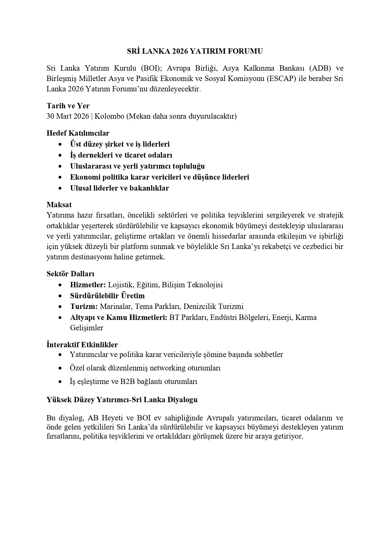 Sri Lanka Yatırım Kurulu (BOI); Avrupa Birliği, Asya Kalkınma Bankası (ADB) ve Birleşmiş Milletler Asya ve Pasifik Ekonomik ve Sosyal Komisyonu (ESCAP) ile beraber Sri Lanka 2026 Yatırım Forumu’nu düzenleyecektir.