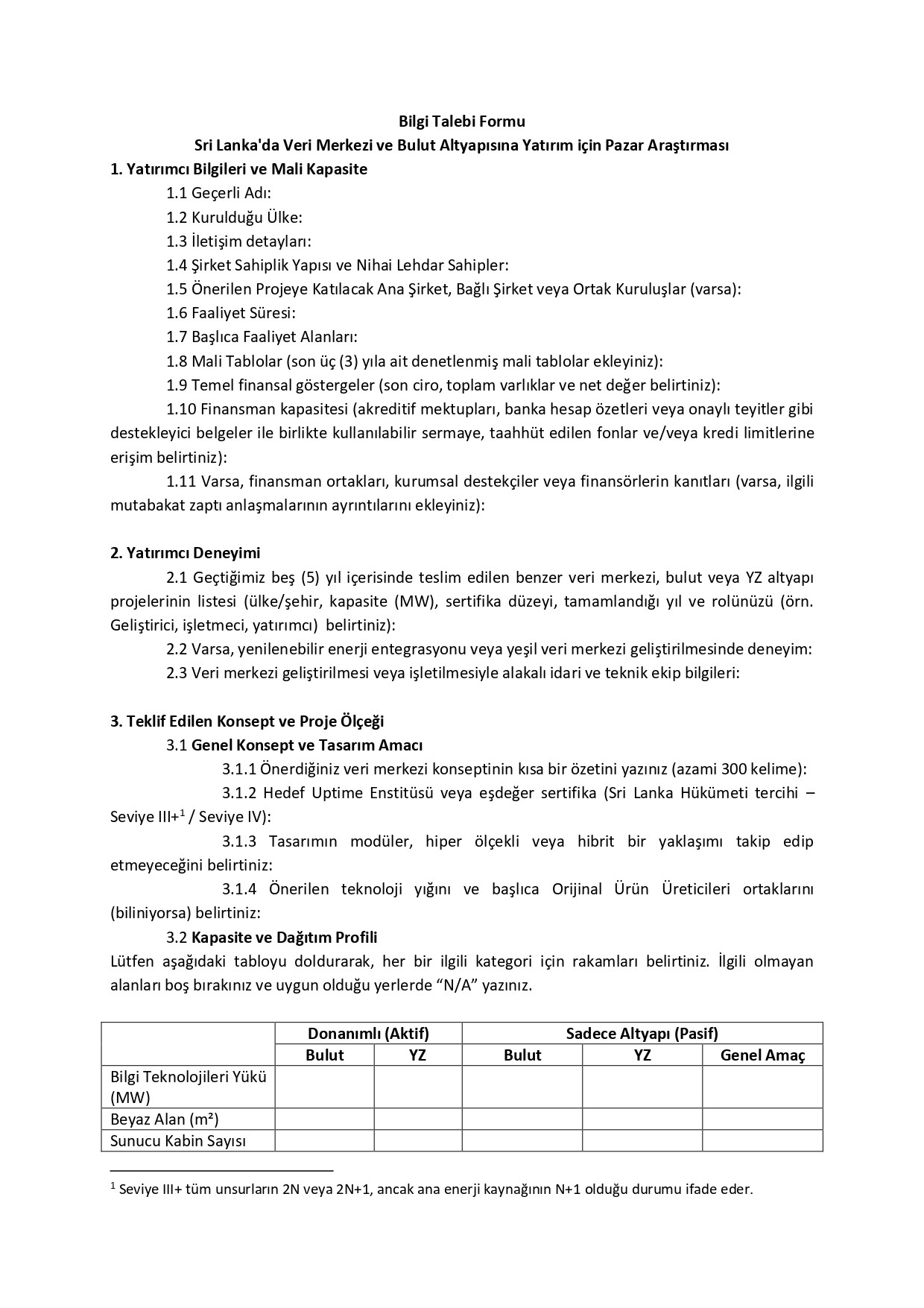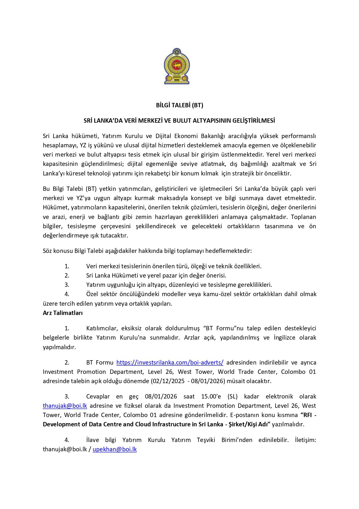 5.12.2025 - 16:10 Sri Lanka’da Veri Merkezi ve Bulut Altyapısı Geliştirilmesi İçin Bilgi Talebi Daveti